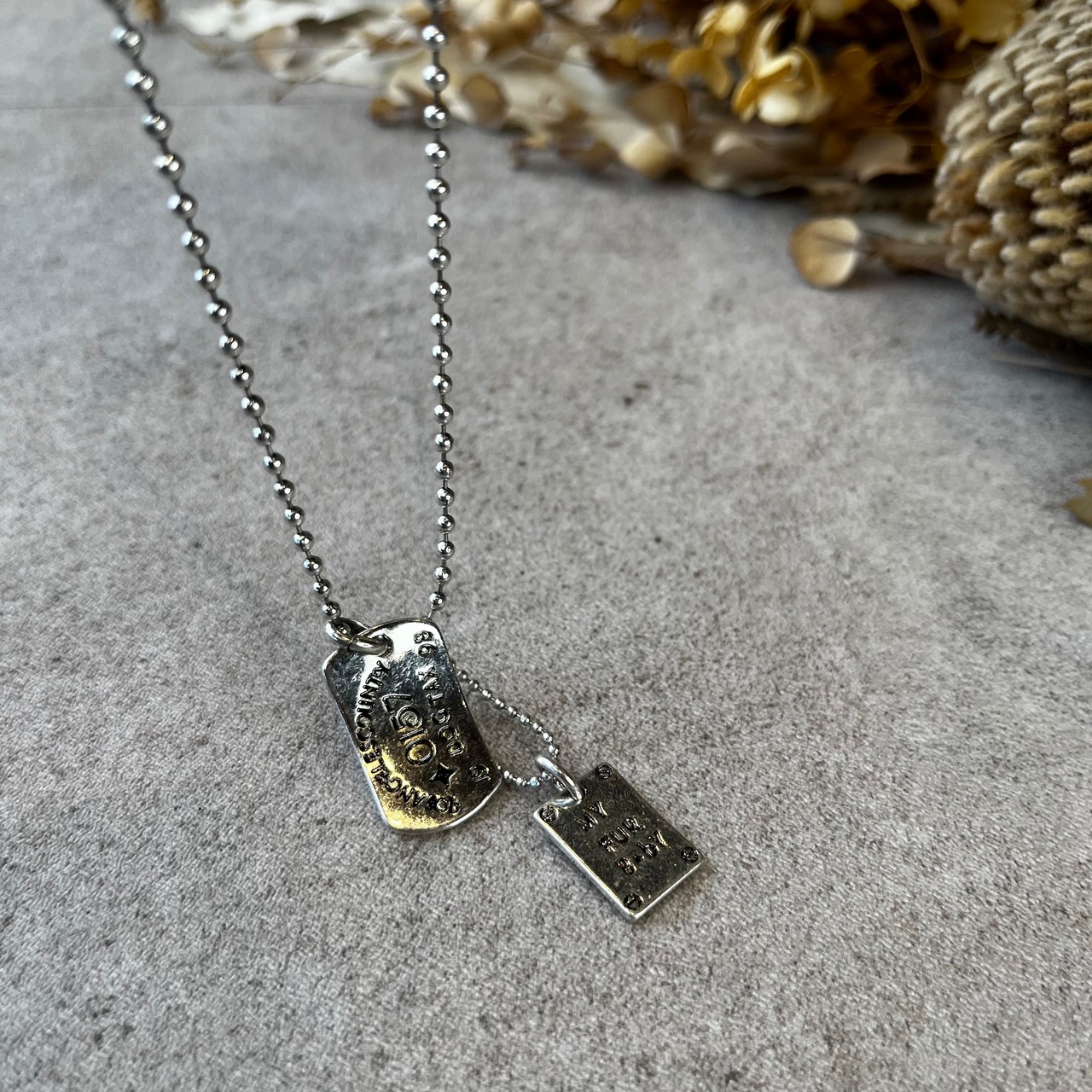 ドッグタグ風の2種類のチャームと、ボールチェーンを組み合わせたロングネックレス。