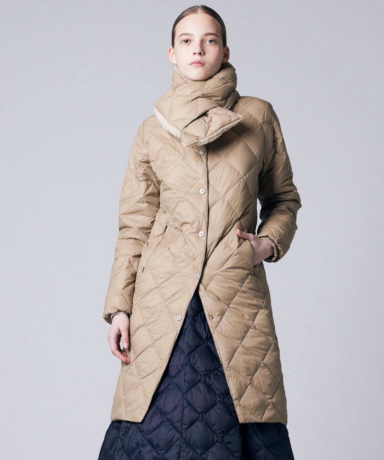 ダイヤキルトが上品な印象、レイヤードも楽しめるロング丈のクルーネックダウンジャケット。