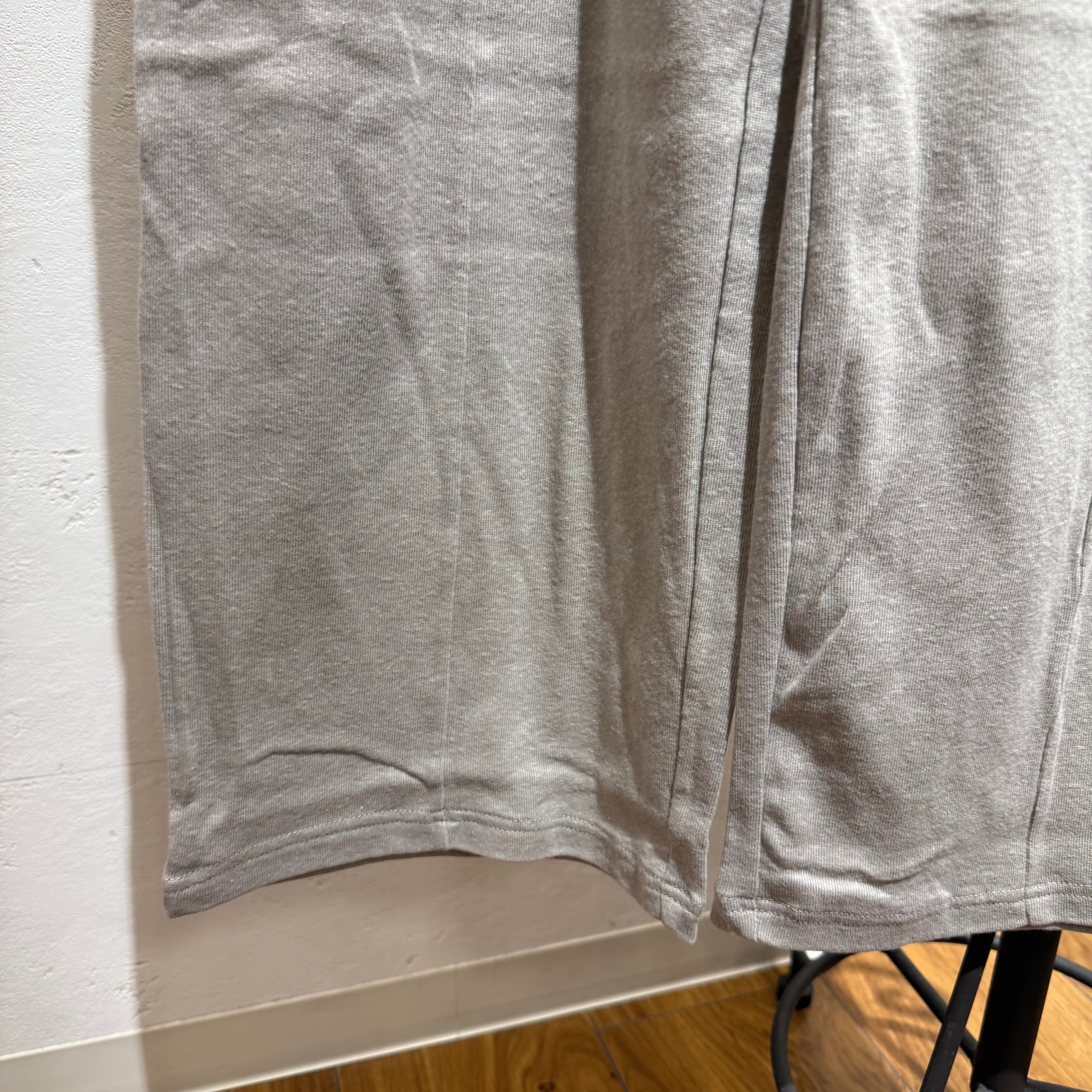 フロントに入った縦接ぎが足長効果を演出。とろけるような柔らかさが魅力の天竺カットソーを使用。落ち綿と呼ばれる紡績過程で生じる綿くずを再利用することで環境負担を減らしサステナブルなコットンを使用しています。不均一に仕上げたムラ感が、豊かな表情とヴィンテージ感のある風合いをもたらしています。