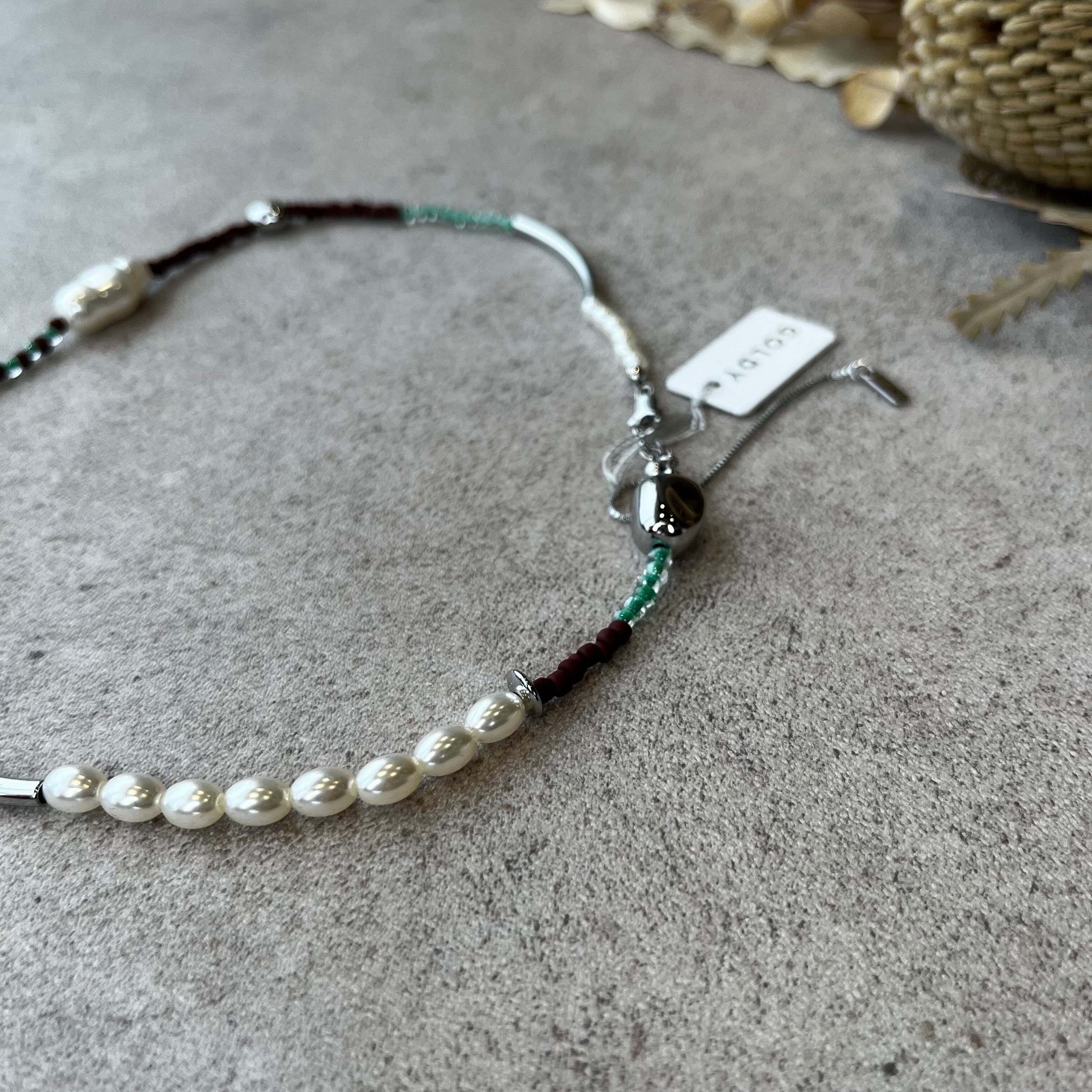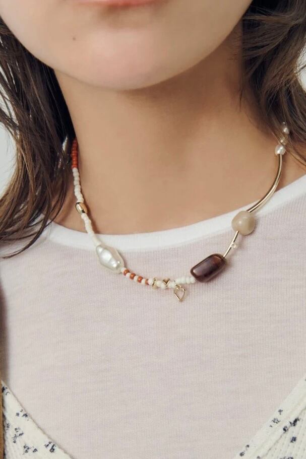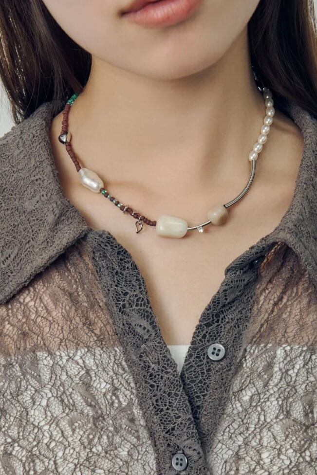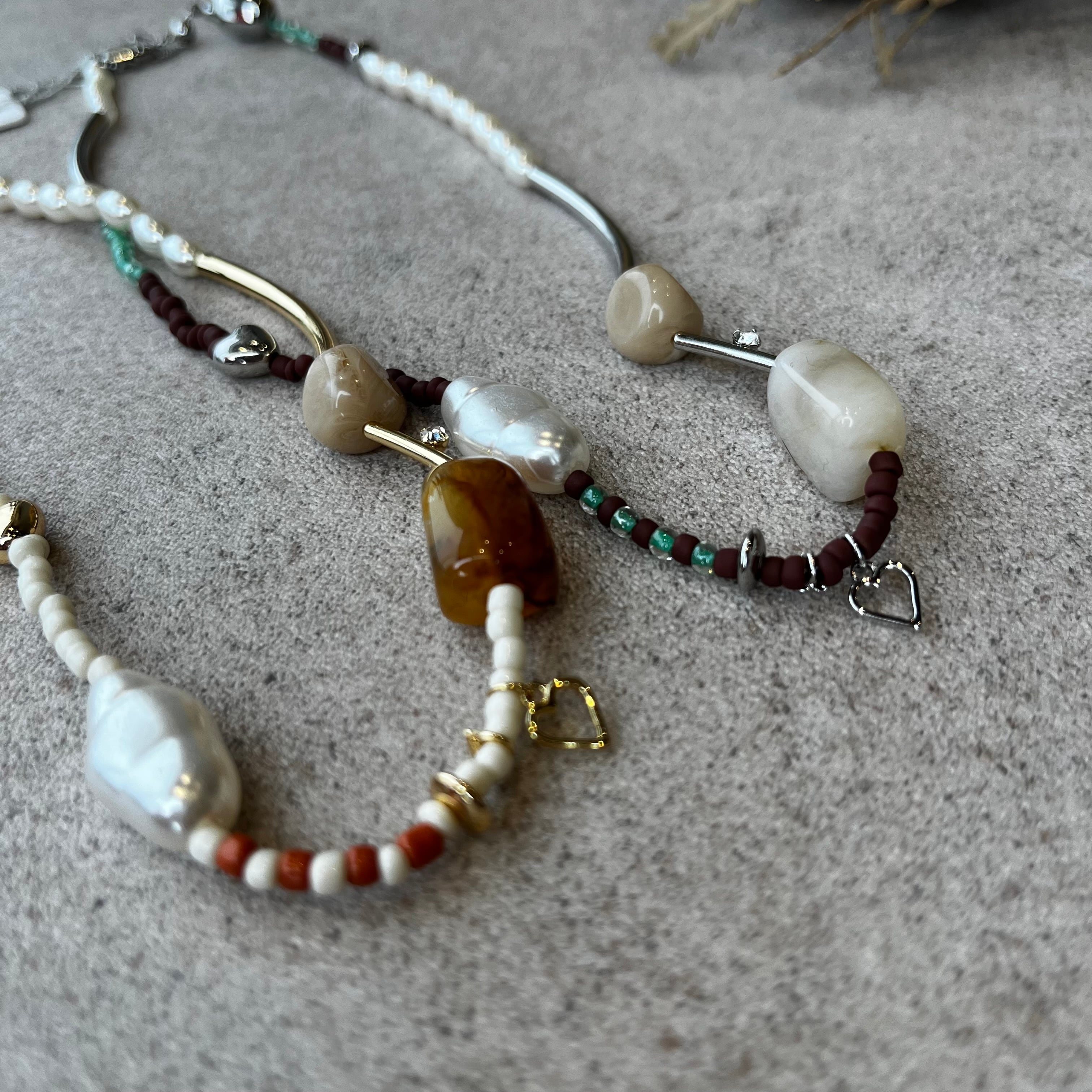 メタルやカラービーズ、パールをランダムに組み合わせたネックレス。