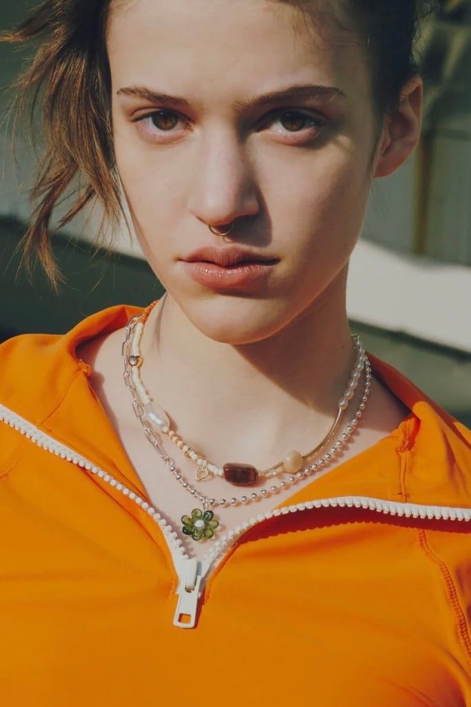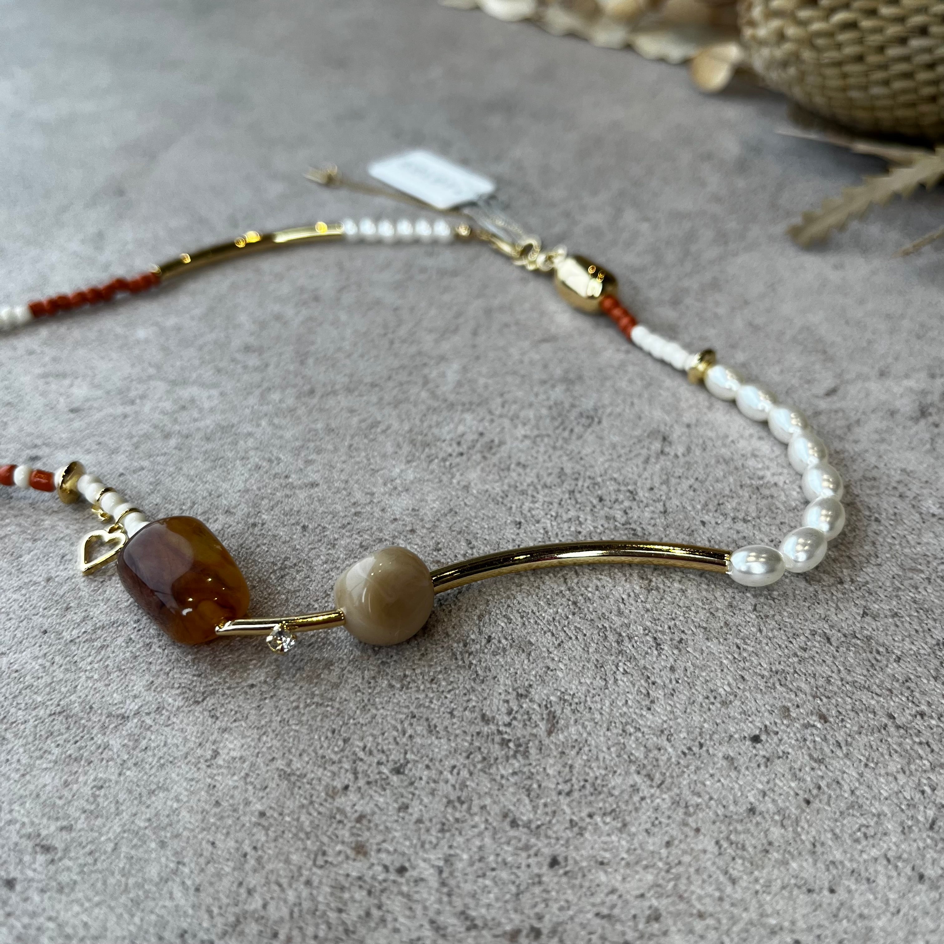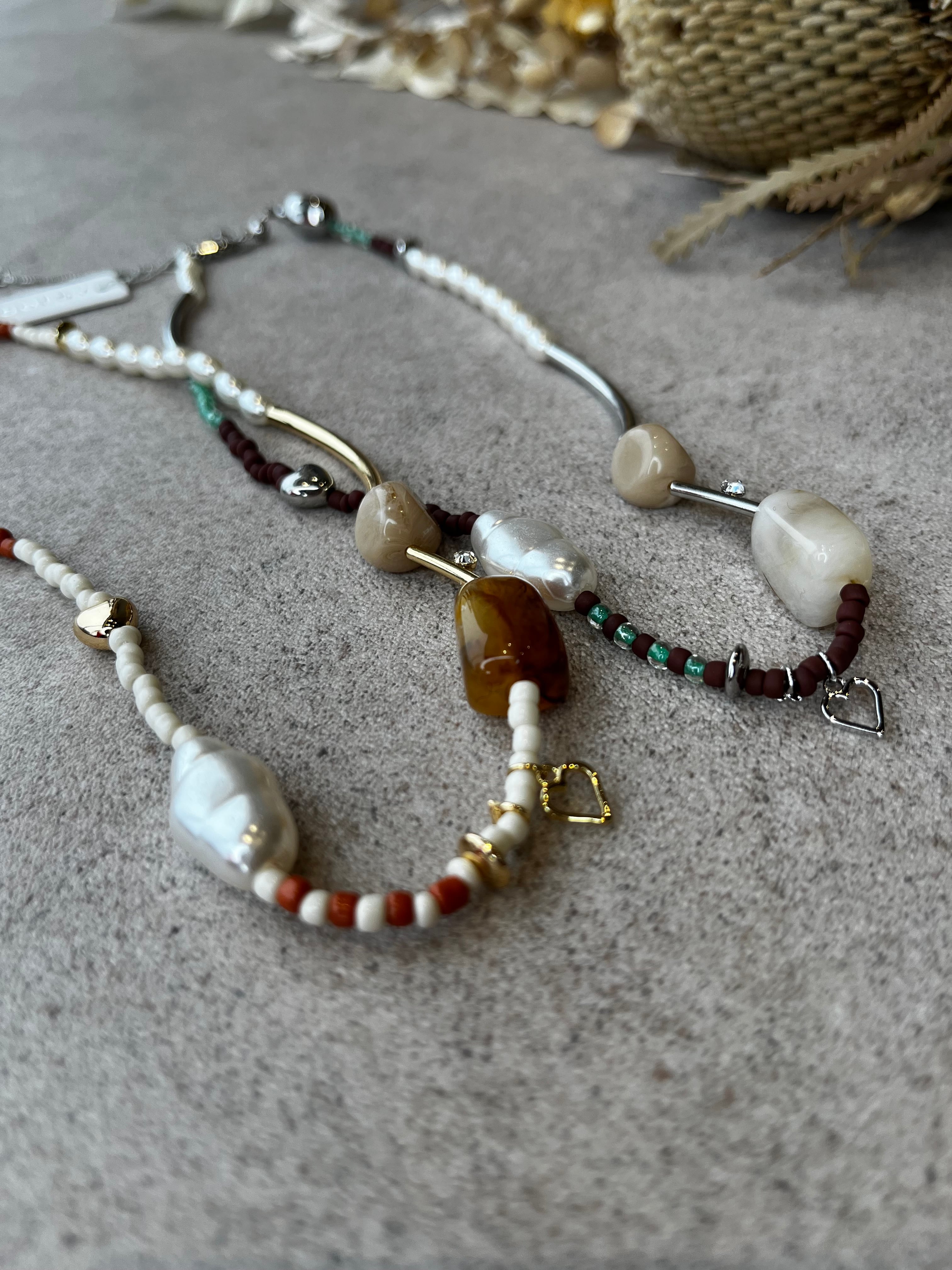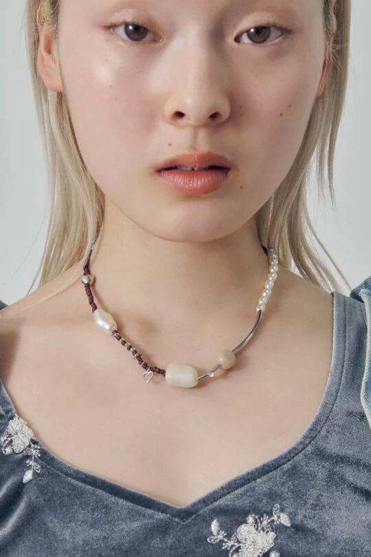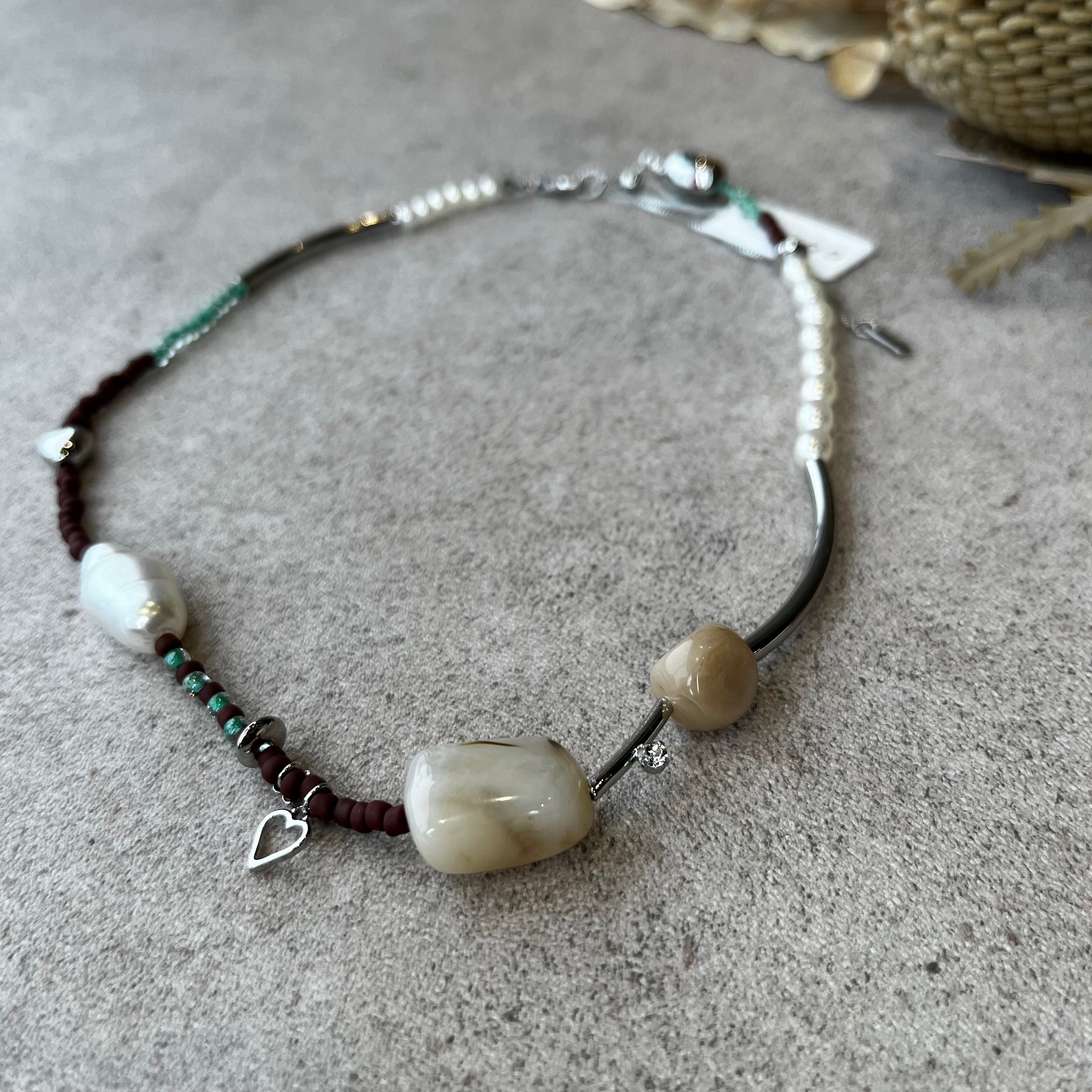 メタルやカラービーズ、パールをランダムに組み合わせたネックレス。