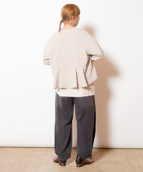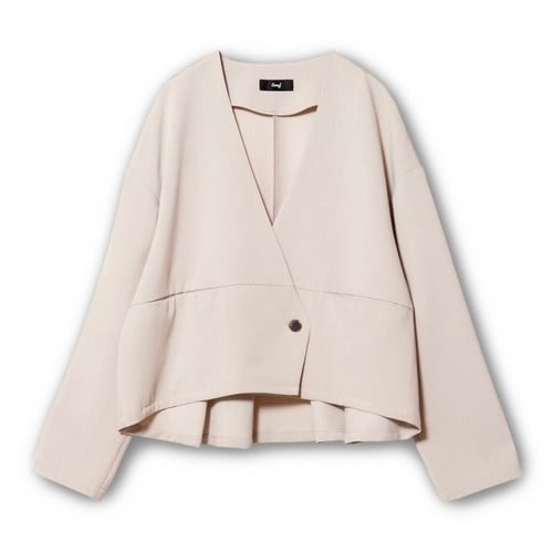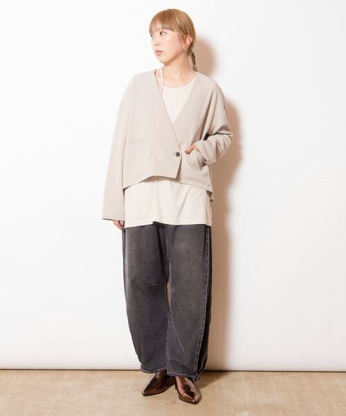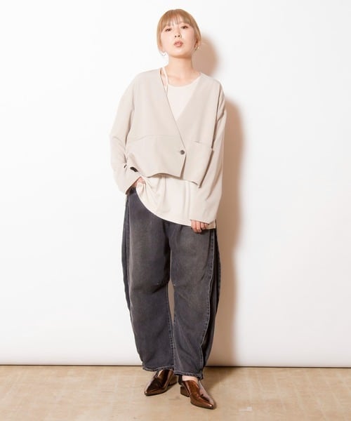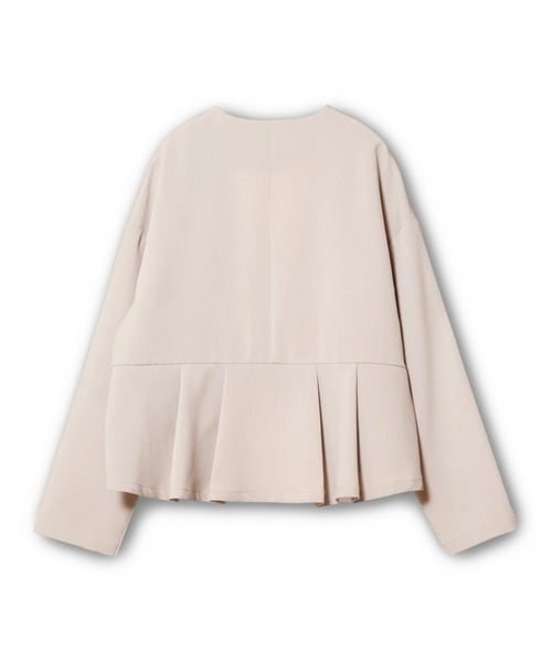 シンプルを極めたノーカラージャケットに、ペプラム切替が軽やかな動きを添えて後ろ姿までバランスよく整うデザイン。