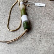 コードに通したビーズや、スネークチェーンを組み合わせた存在感のあるチャーム。