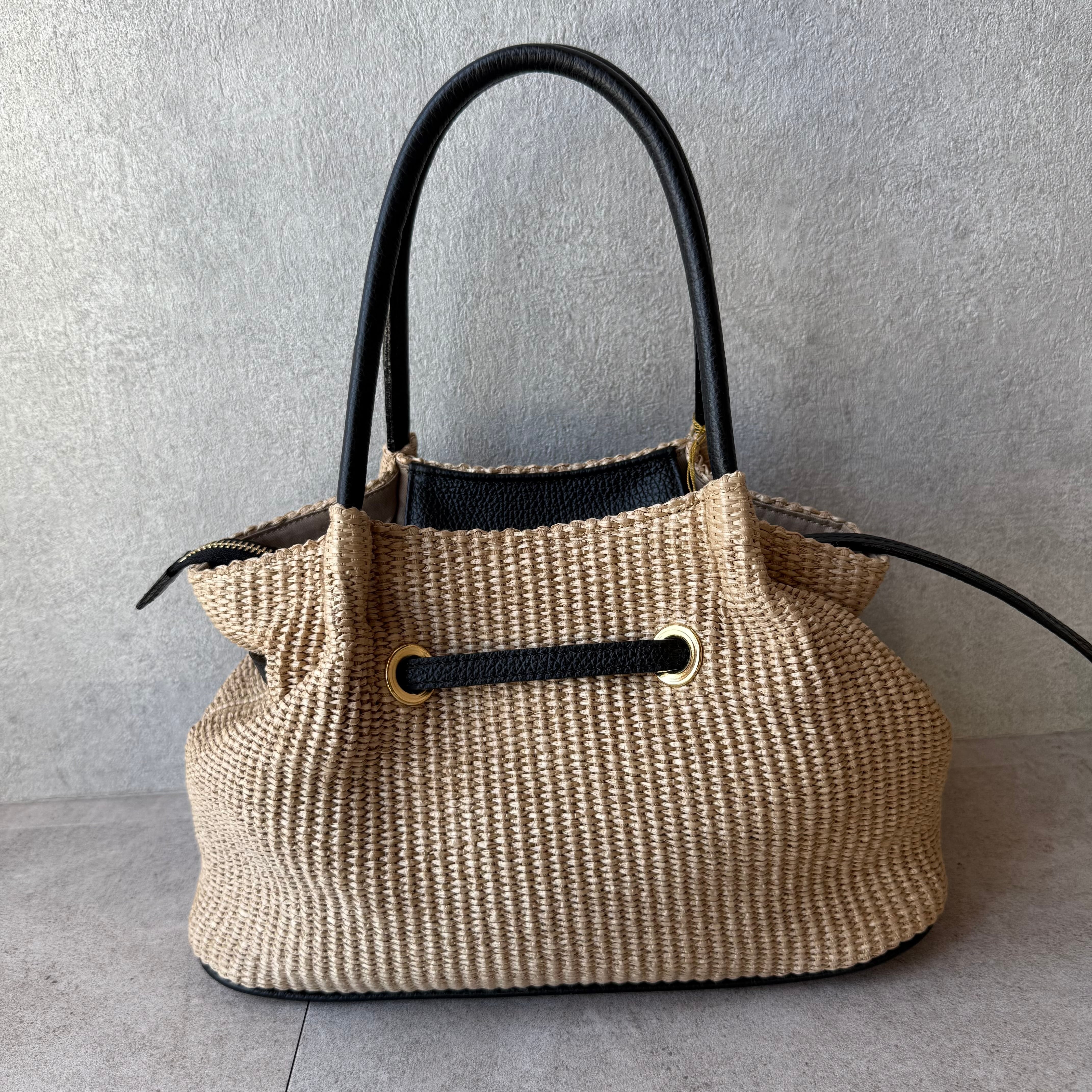 ラフィアのような涼やかな素材感が、春夏コーディネートに季節感をもたらす"VIOLAd'ORO ヴィオラドーロ"のSANDRO。台形フォルムをベースに、フロントのひねり金具がアクセントを添えるシックなデザインです。必需品が余裕で収まる収納力があり、デイリーからお仕事まで幅広く活躍します